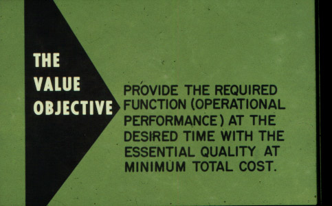 Various statements of Value objectives; 9 slides (Folder #: 219-227). They were taken by the Jet Engine Department and all were taken of materials used in 1964.