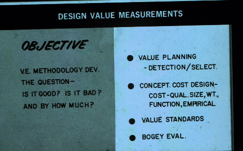Various statements of Value objectives; 9 slides (Folder #: 219-227). They were taken by the Jet Engine Department and all were taken of materials used in 1964.