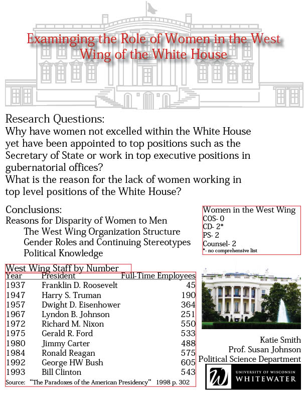 A poster containing visuals and text describing an undergraduate research project completed at the University of Wisconsin--Whitewater. Summarizes the questions and conclusions of the accompanying research paper. The author examined why few women are employed in top level positions in the White House.